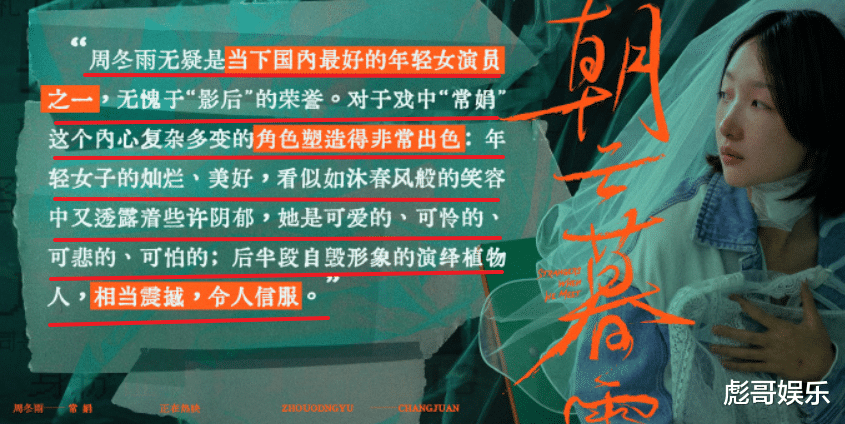 这一次她的搭档是61岁的范伟,真的是做了很大的改变,而且导演是大家耳熟能详的康熙皇帝张国立,在《朝云暮雨》中,可以看出周冬雨演绎出来的角色耐人寻味,对待细节特别注重,她不再依赖外在的表情和动作表达剧本,而是更注重人物内心的情感表达。