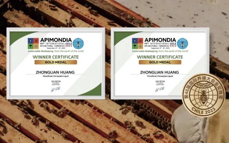 在2023年智利举办的第48届国际养蜂大会蜂蜜大赛中,甜蜜家蜂业选送的荔枝蜜、椴树蜜凭借出众品质,在全球众多参赛产品中脱颖而出,一举斩获单花蜜组别两枚金奖。