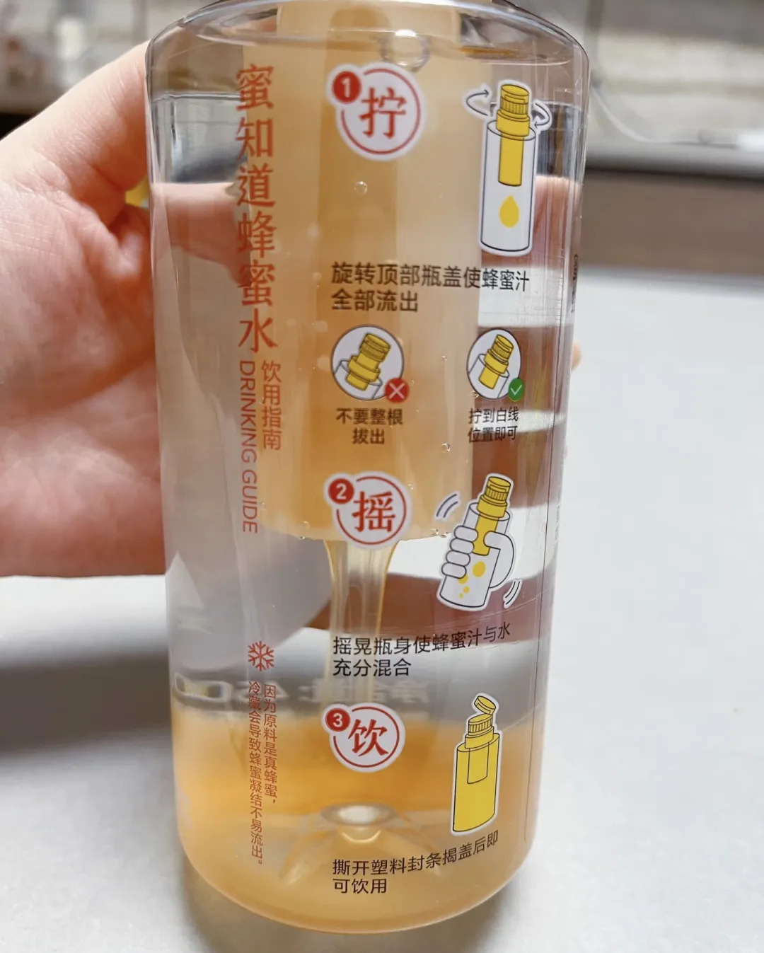 消费者饮用前只需轻轻一扭、用力一摇,就能实现蜂蜜与水充分融合,喝到如同现冲般新鲜的蜂蜜水。