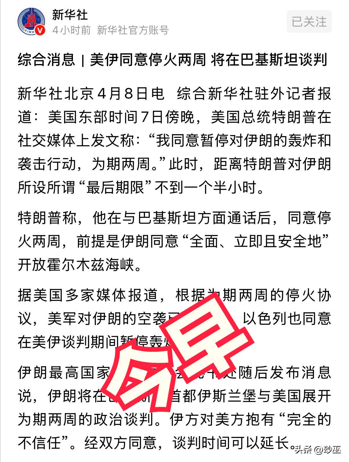 目前是停战两周,感觉更像是双方都需要一个战术喘息,补充下弹药和粮草准备再次开战,毕竟美国驶往中东的航母还没掉头呢,别到4月21日又重新开战了?