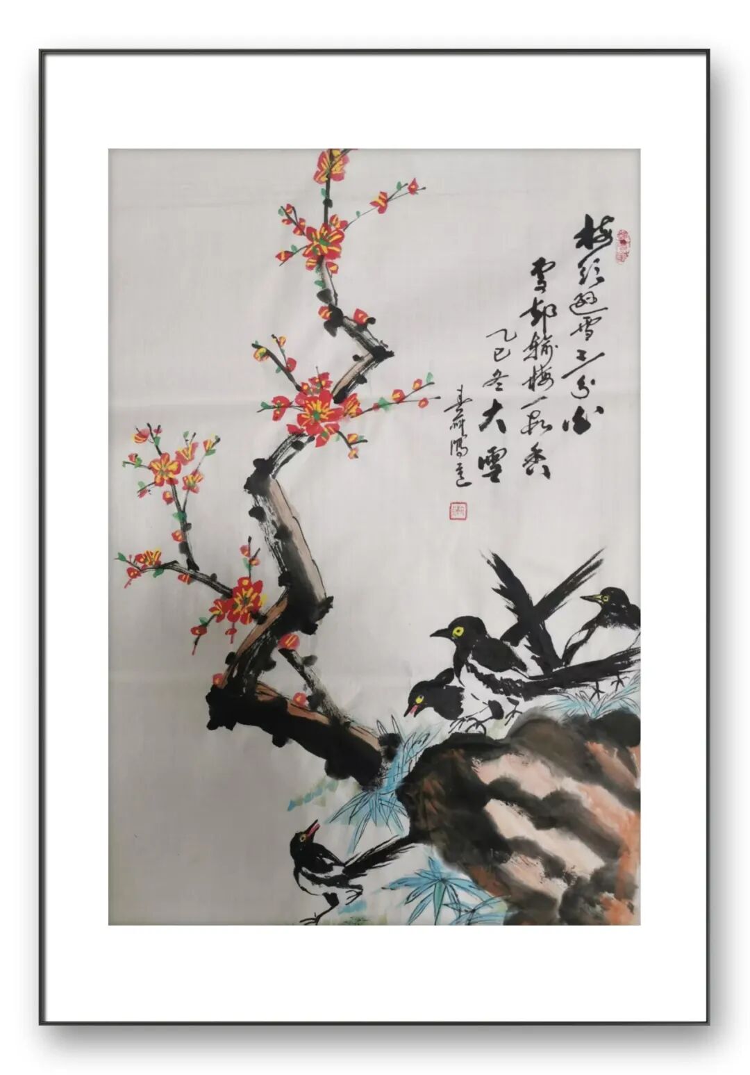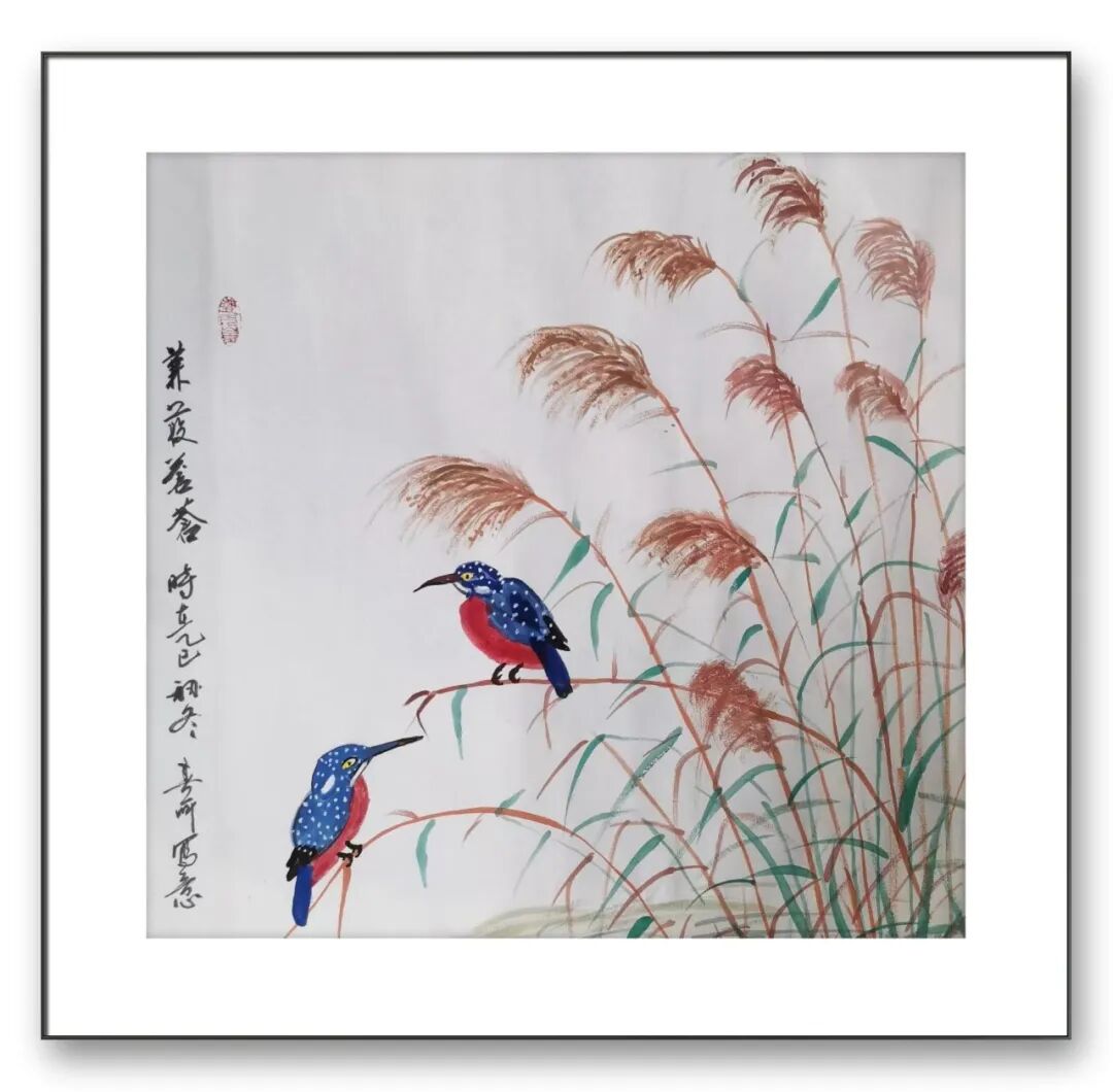 在墨法运用上,马春所深谙“墨分五色”之妙,以浓、淡、干、湿、焦的墨色变化,营造出丰富的空间层次与质感。其笔下的芦苇、竹枝、梅干,或以淡墨晕染出枝叶的蓬松,或以浓墨点染出枝干的苍劲,干湿对比间尽显自然生机。如《蒹葭苍苍》中的芦苇,以淡墨写茎,浓墨点叶,芦花以干笔轻扫,虚实相生,将芦苇在风中摇曳的姿态与秋日的苍茫意境完美呈现;而《梅鹊报春》中的梅干,以焦墨顿挫勾勒,笔力雄健,尽显老梅的苍劲古朴,与枝头绽放的红梅形成刚柔并济的视觉张力。