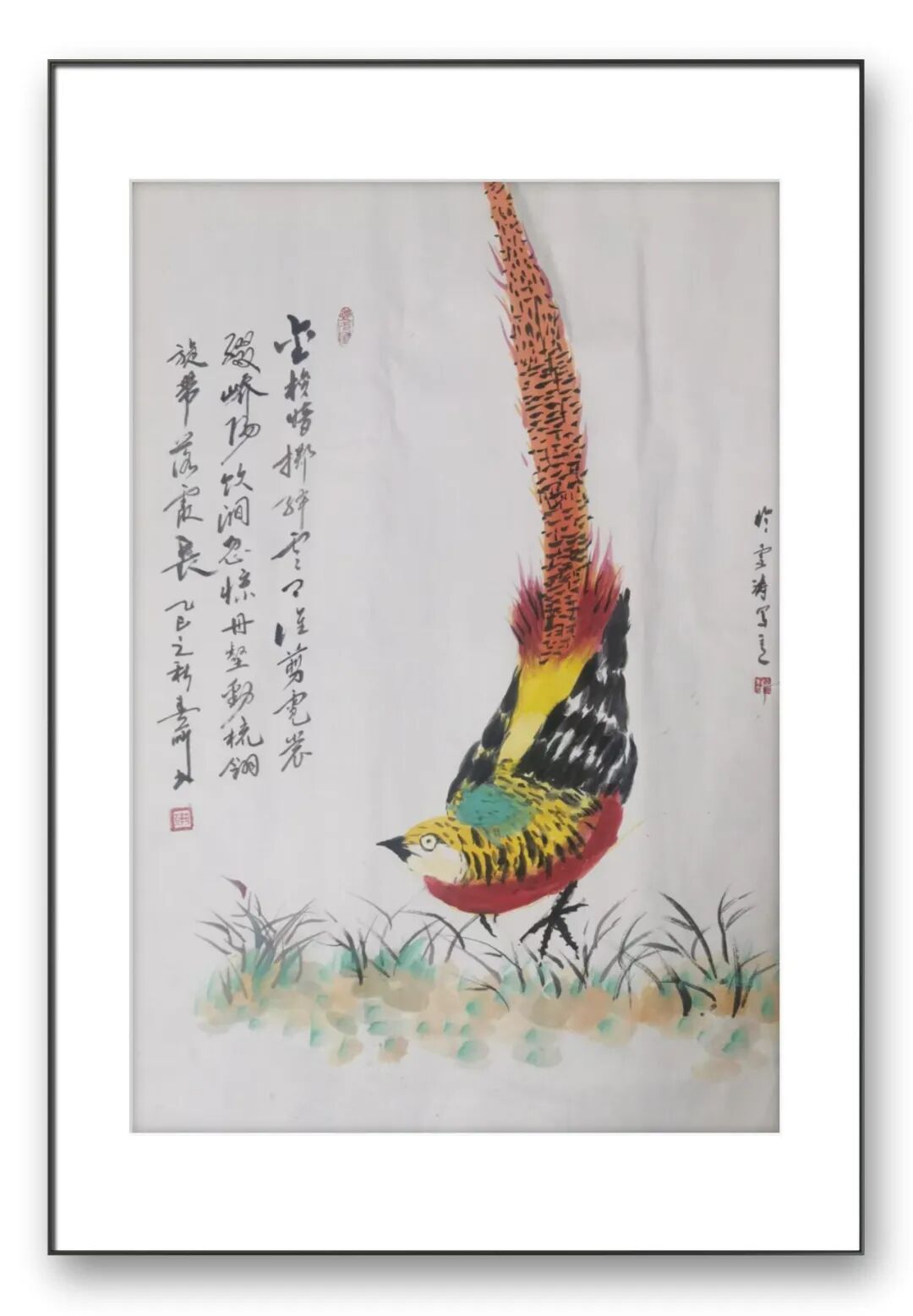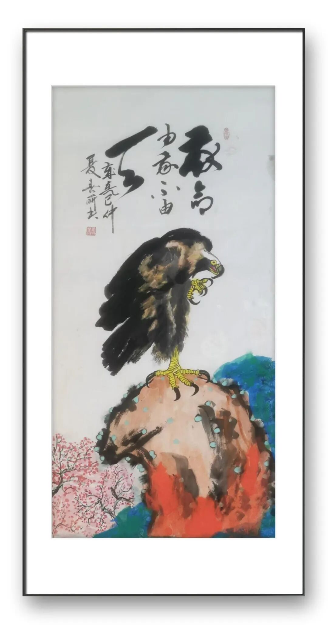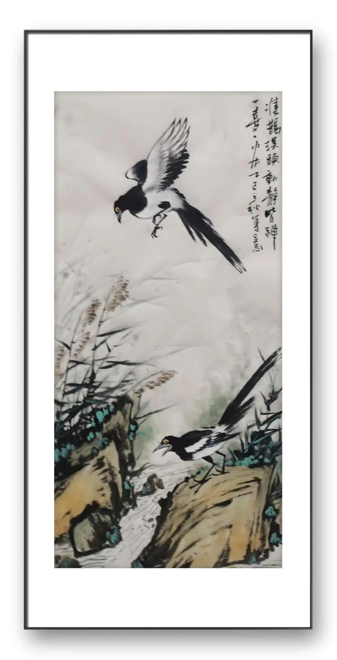 马春所的花鸟画,首先在笔墨上彰显出对中国传统写意精神的深刻领悟与扎实传承。中国画以笔墨为灵魂,“笔为骨,墨为韵”,在马春所的作品中,这一核心准则得到了淋漓尽致的体现。观其笔下的喜鹊、雄鹰、锦鸡等禽鸟,线条刚劲有力、顿挫有致,勾勒出禽鸟的骨骼结构与动态神韵:如《喜鹊溪涧图》中振翅欲飞的喜鹊,翅羽以浓墨挥写,笔势奔放而不失法度,线条的粗细变化精准捕捉到翅膀扇动的力量感;爪部以劲挺的细笔勾勒,尖锐锋利,尽显禽鸟的灵动矫健;尾羽则以泼墨法晕染,墨色浓淡相宜,在虚实之间营造出飘逸的动感。而《傲高由宙》中的雄鹰,更是将笔墨的力量感推向极致:鹰身以浓淡交错的墨块皴擦,层次丰富,尽显猛禽的雄浑气势;利爪以金黄重色勾勒,线条遒劲如铁,爪尖锋利如刃,仿佛能穿透纸背,将雄鹰睥睨天下的王者之气刻画得入木三分。