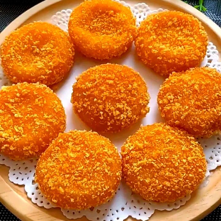 3.将大面团分成小剂子,搓圆后再轻轻压成小饼状。如果喜欢脆皮,可以在饼胚两面轻轻沾点水,然后裹上一层面包糠,用手压紧。
