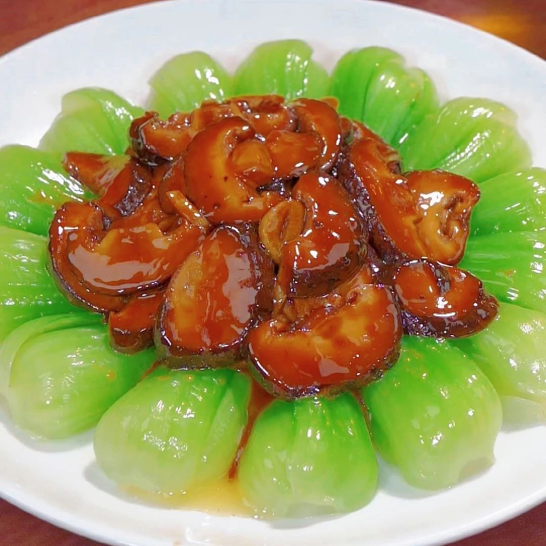 5.将烧好的香菇连同浓稠的芡汁,一起均匀地浇在之前摆好盘的青菜上即可。