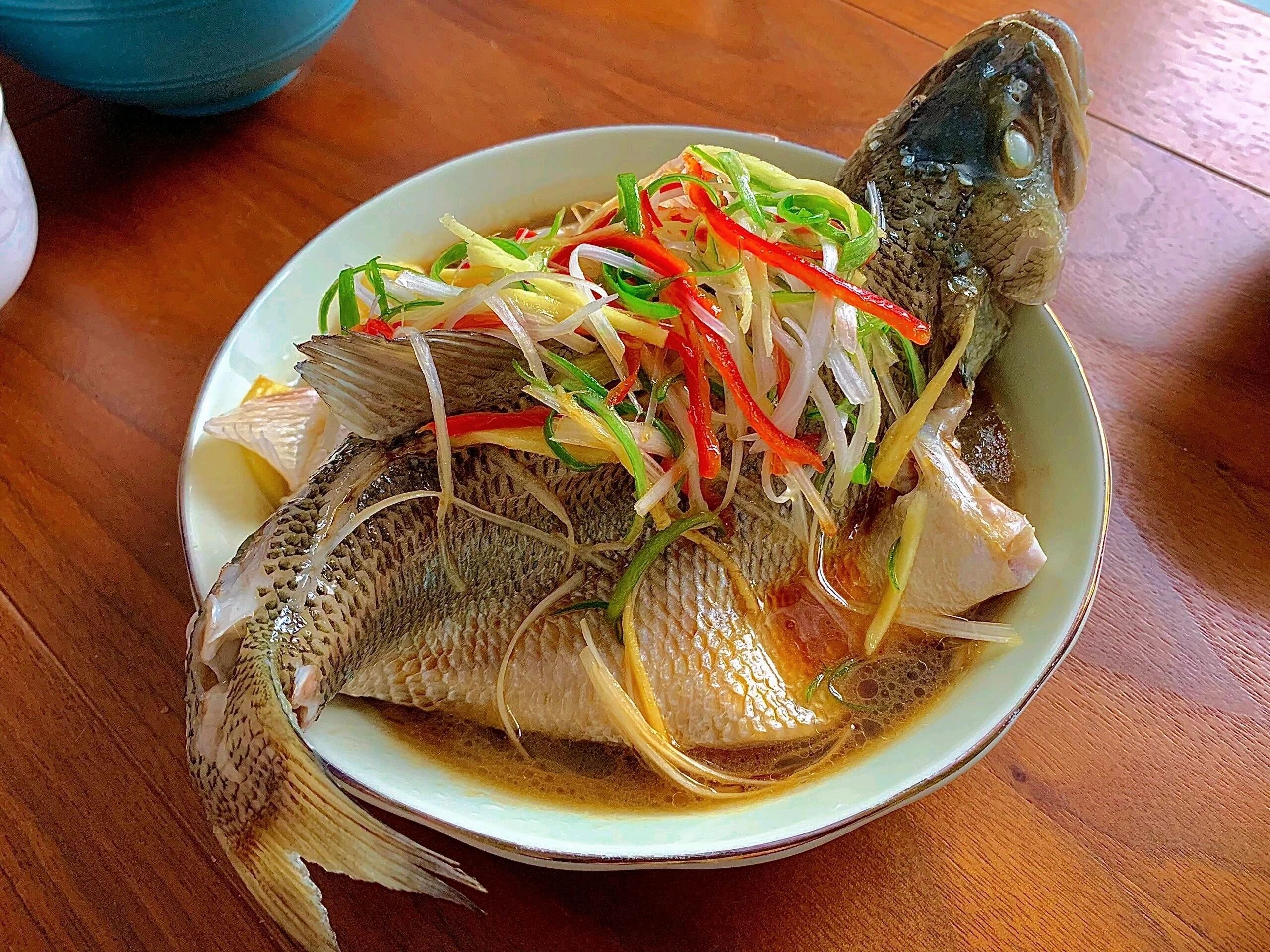 7.鱼蒸好后立即取出,倒掉盘中蒸出的腥水,并拿掉鱼身下的旧姜葱。将泡好的葱姜丝和新的姜丝铺在鱼身上。