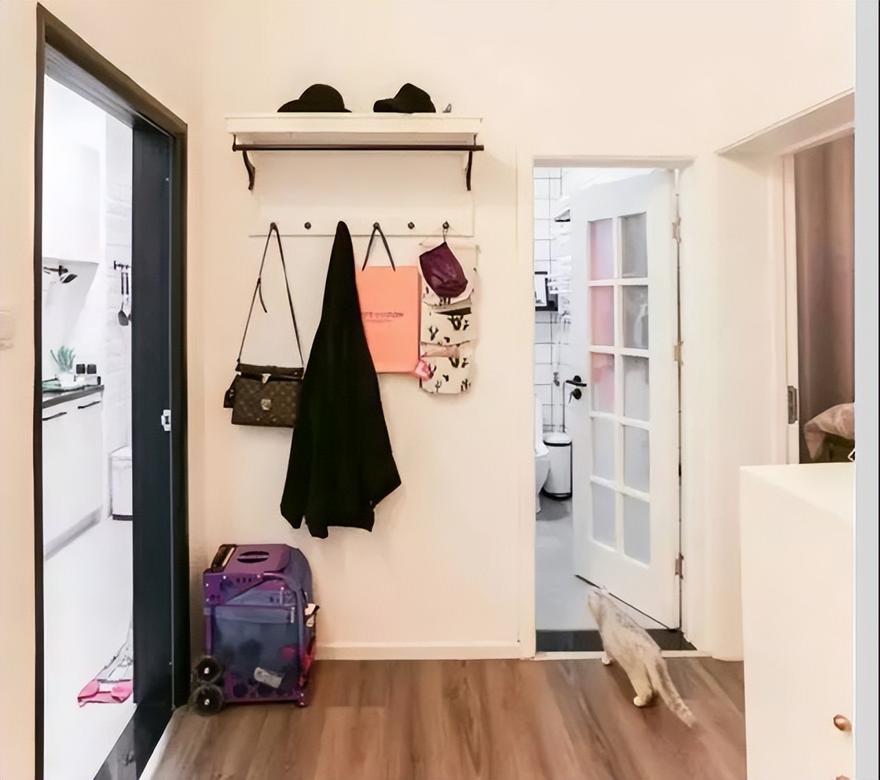 门厅另一边墙面装了置物架和挂钩,可以挂包包、外套、围巾什么的。