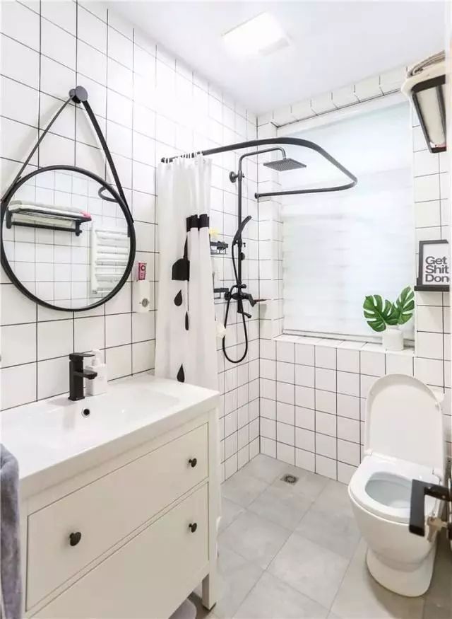 卫生间有点紧凑,淋浴房放不下了,只能弄个浴帘隔断,比较灵活一些,这样看着不会太过拥挤。