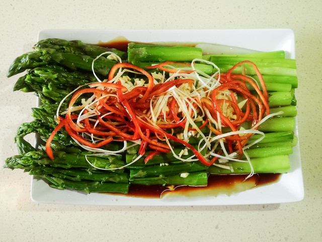 将焯好的生菜摆盘,淋上煮好的酱汁即可。