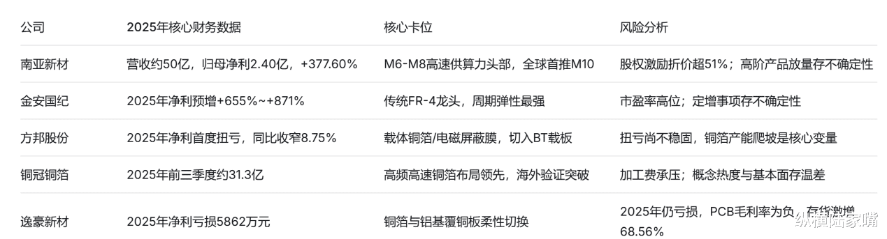 但在这轮AI驱动的产业链向上传导中,五只核心标的的基本面与盈利质量存在天壤之别:方邦股份2025年年报首度扭亏,但扭亏根基尚不稳固;金安国纪2025年业绩预报增速超6倍,市盈率却飙升至高位;南亚新材全年营收首次突破50亿元,却推出折价激励方案稳住核心团队;逸豪新材2025年全年亏损5862万元,但2026年一季度净利润同比增长显著;铜冠铜箔在铜箔加工费持续压缩下利润大幅下滑,却因被认为是“国内为数不多实现高频高速铜箔量产”的厂商而备受关注。