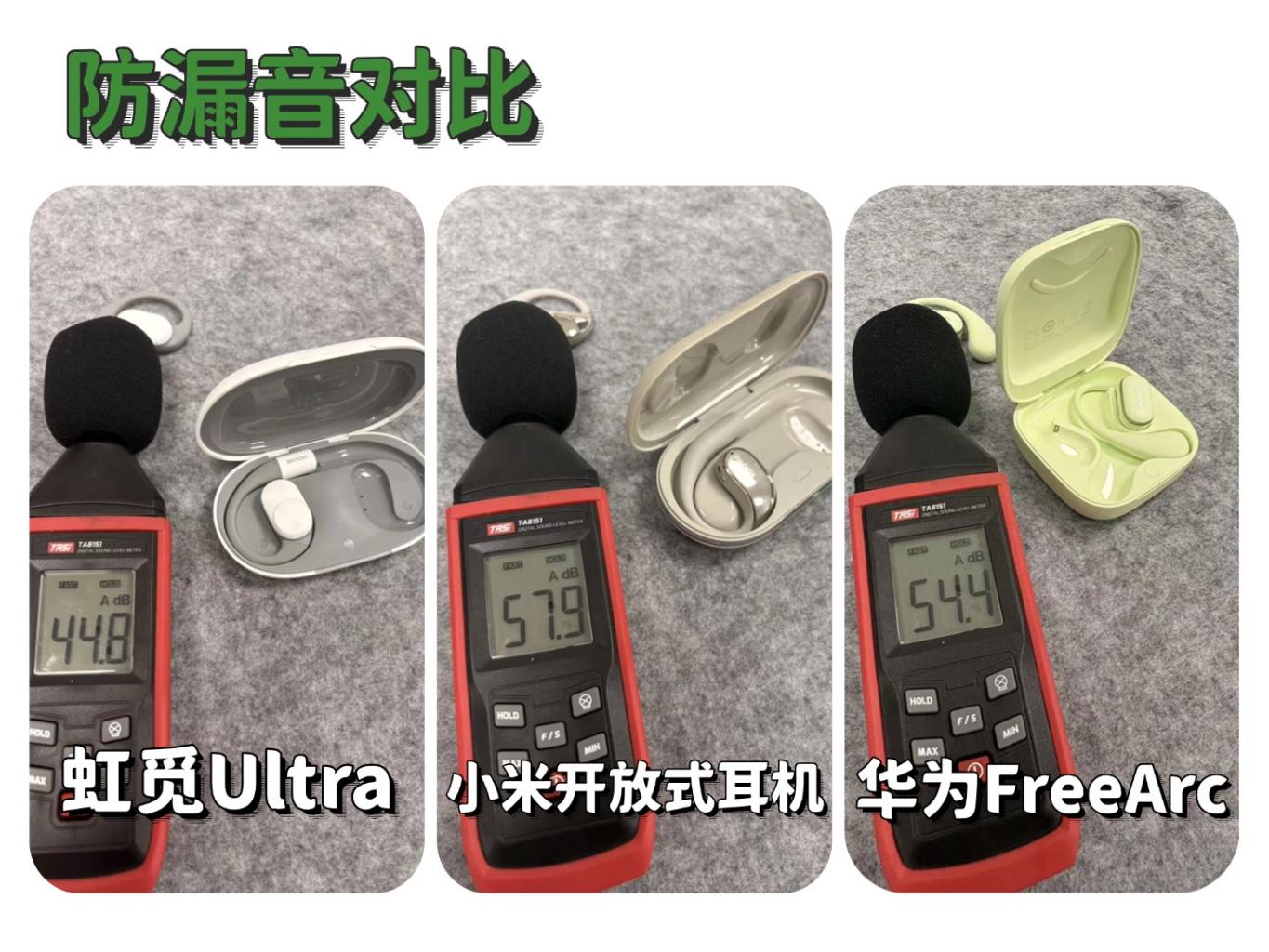 防漏音是开放式耳机的一大痛点,也是用户选购时的重要考量,三款耳机在防漏音处理上的投入不同,实际效果也有明显差距。