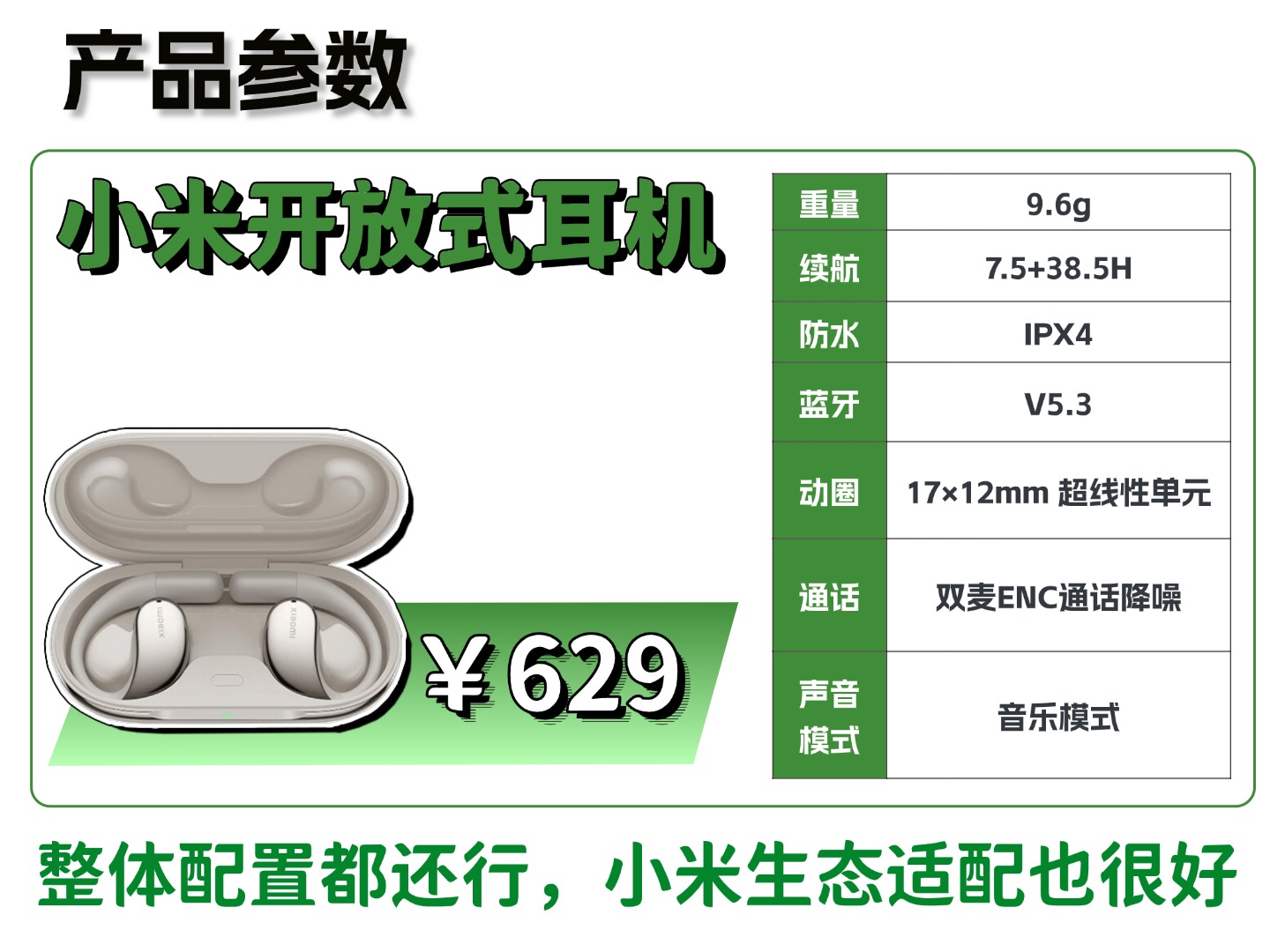 小米开放式耳机则是小米生态用户的专属选择,629 元的价格,音质、防漏音、便携性都表现普通,唯一的优势是与小米手机、平板等设备的无缝适配,开盖即连、跨设备切换无延迟,能提升生态内的使用体验。但如果是非小米生态用户,这款耳机毫无竞争力,同等预算能买到综合表现更优的产品。