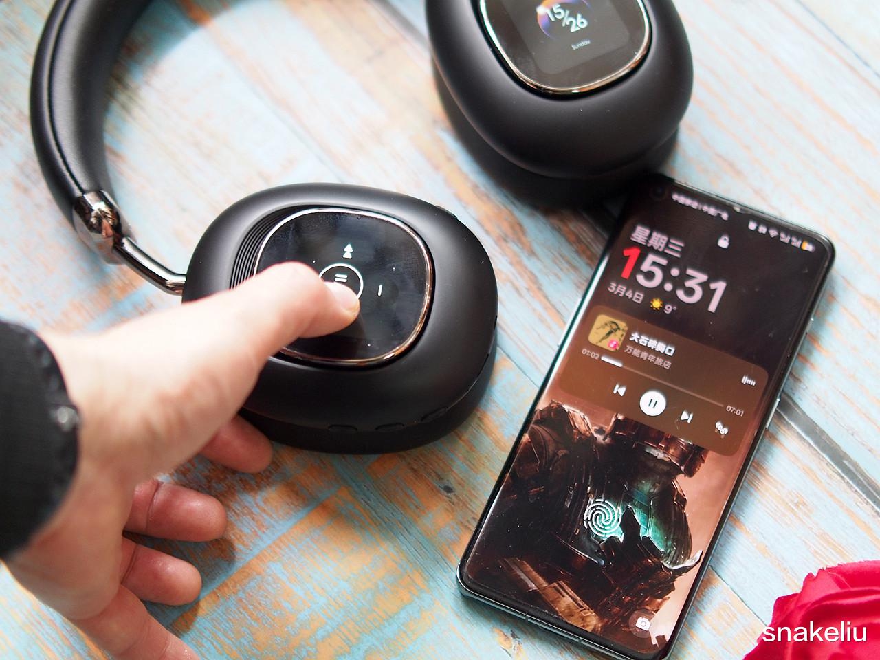 耳机大尺寸的耳罩,柔软佩戴舒适。即使我戴了眼镜也是没有感觉不适,而且长时间佩戴也没有不适感。两侧的屏幕很好的展示了佩戴耳机用户的个性,而且还有不少实用功能。