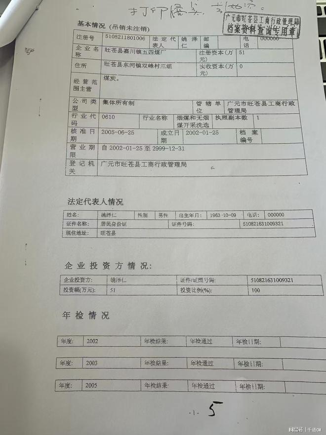 1996 年,姚泽仁通过 “以租抵偿贷款” 的合法方式,获得了旺苍县嘉川镇五四煤厂的实际经营权与所有权,工商注册档案明确记载其 “投资比例 100%”,该厂成为其个人独资经营的企业。此后多年,姚泽仁悉心打理煤厂运营,凭借自身努力维系企业发展。