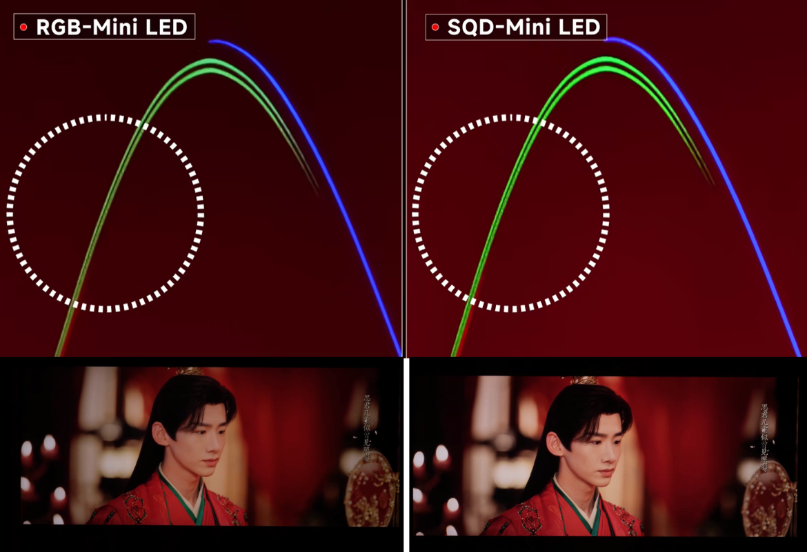 就以现在市面上两种主流的画质技术——RGB Mini LED和SQD Mini LED为例,在这三点上的表现,差距可能比很多人想象的要大得多: