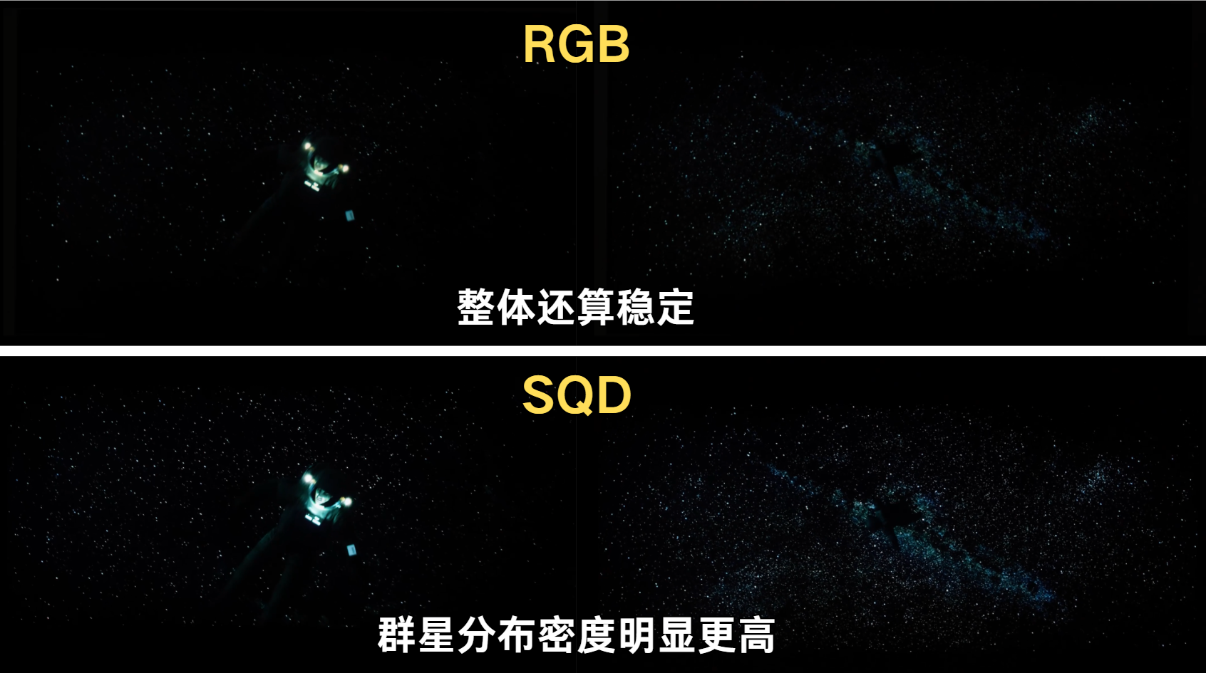 从实际效果来看就很明显了,在播放银河画面时,单看RGB电视的画面表现是不是感觉还可以?星星、空间站都能清晰呈现;但一对比SQD电视,呈现出来的星星明显更密集,而且黑场深邃纯净,这就是高对比度所带来的优势,可以看到更多的画面细节。