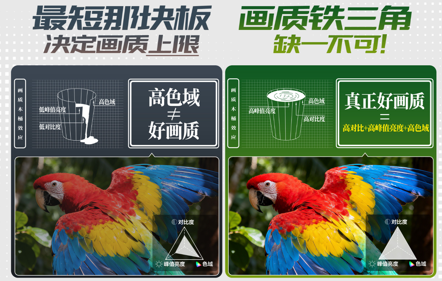 真正的好画质,缺一个都不行决定画质好坏的不是某个单一参数,而是业内公认的画质铁三角:对比度、峰值亮度、色域。三者必须都得在线,缺一不可。