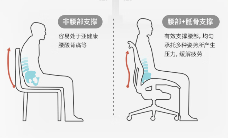 最重要的是腰背,一定要有独立腰靠、最好是能动态追腰的那种,不管你是正坐、前倾敲键盘还是后仰休息,都能贴合住,不会让腰悬着。