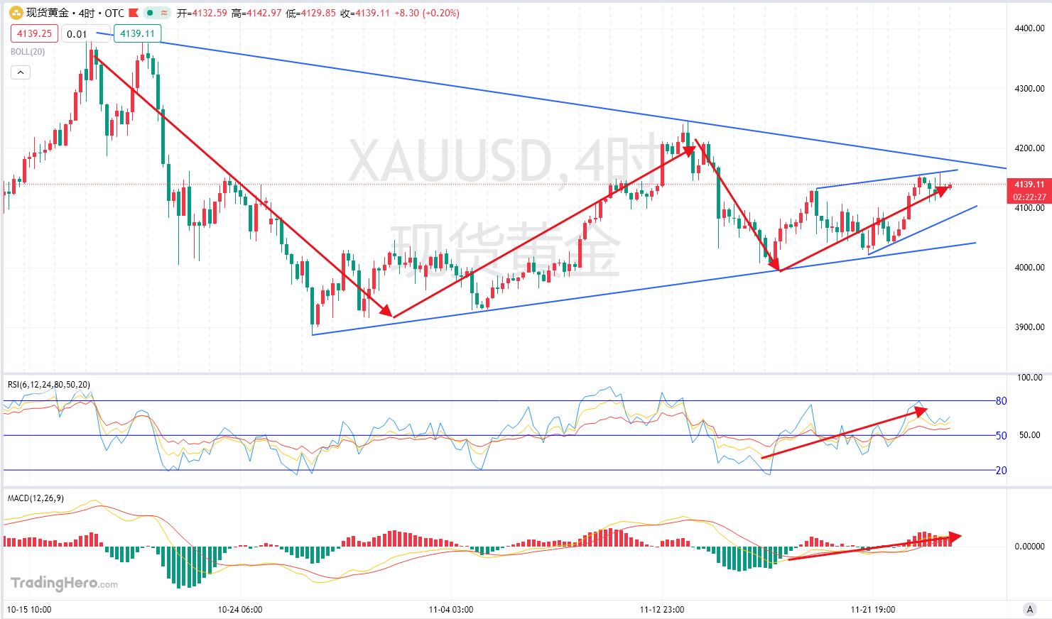 从黄金4小时盘面来看,价格已逐渐逼近收敛三角形的上轨压力位,目前正等待向上突破的时机。市场对12月降息的预期概率已高达80%,看涨情绪持续升温。尽管地缘政治方面传出积极消息,但最终期限被推迟,并未带来实质性进展,这为黄金提供了有力支撑。昨日金价未能站稳4150上方,若今日能有效上破并企稳该位置,则收敛三角形向上突破的可能性将进一步增大。