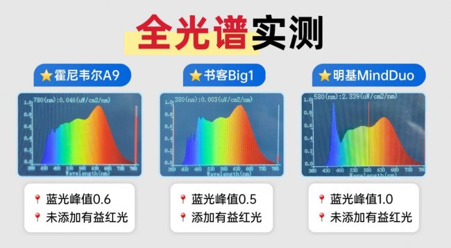 实测方法:在暗室环境下,将光谱仪放置在模拟读写距离的位置,统一色温至4000K,记录光谱曲线及蓝光峰值表现。