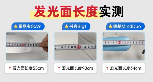 书客Big1的发光面长度达到90cm,这一点在三款中几乎形成了“物理级优势”。搭配900mm航空级光学长臂与460颗SunArc全光谱灯珠的高密度线性排布,光线能均匀铺展,轻松覆盖近2米宽的桌面。实际使用时,它不是把光集中打在书本上,而是形成一个完整、连续的桌面光场,哪怕书本前后移动,亮度变化也非常小。霍尼韦尔A9的发光面为55cm,能够很好覆盖1.2米左右的书桌,核心学习区域照度稳定,但在桌面进一步拉宽时,边缘区域会出现自然衰减。明基MindDuo的发光面长度为34cm,更适合单人、集中式使用场景,对桌面布局的依赖会更明显。