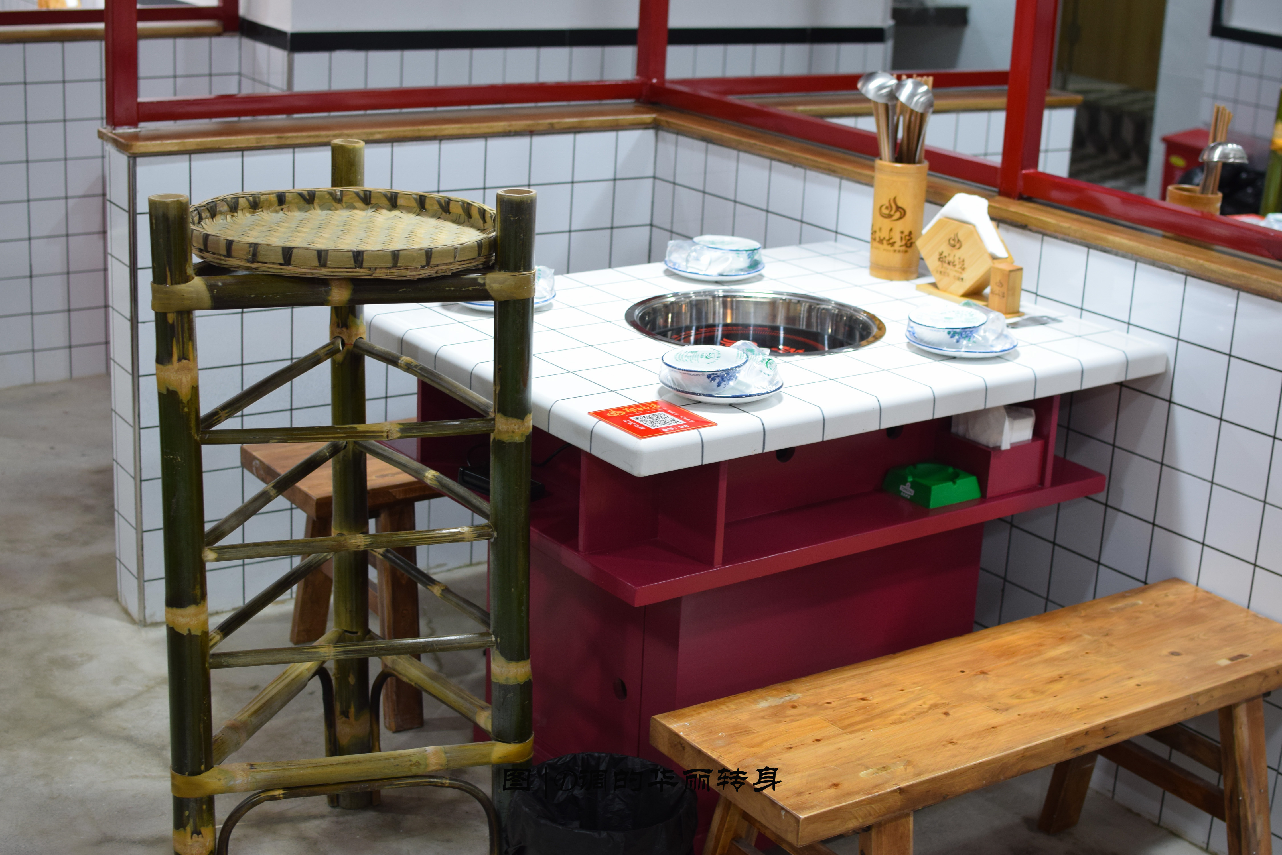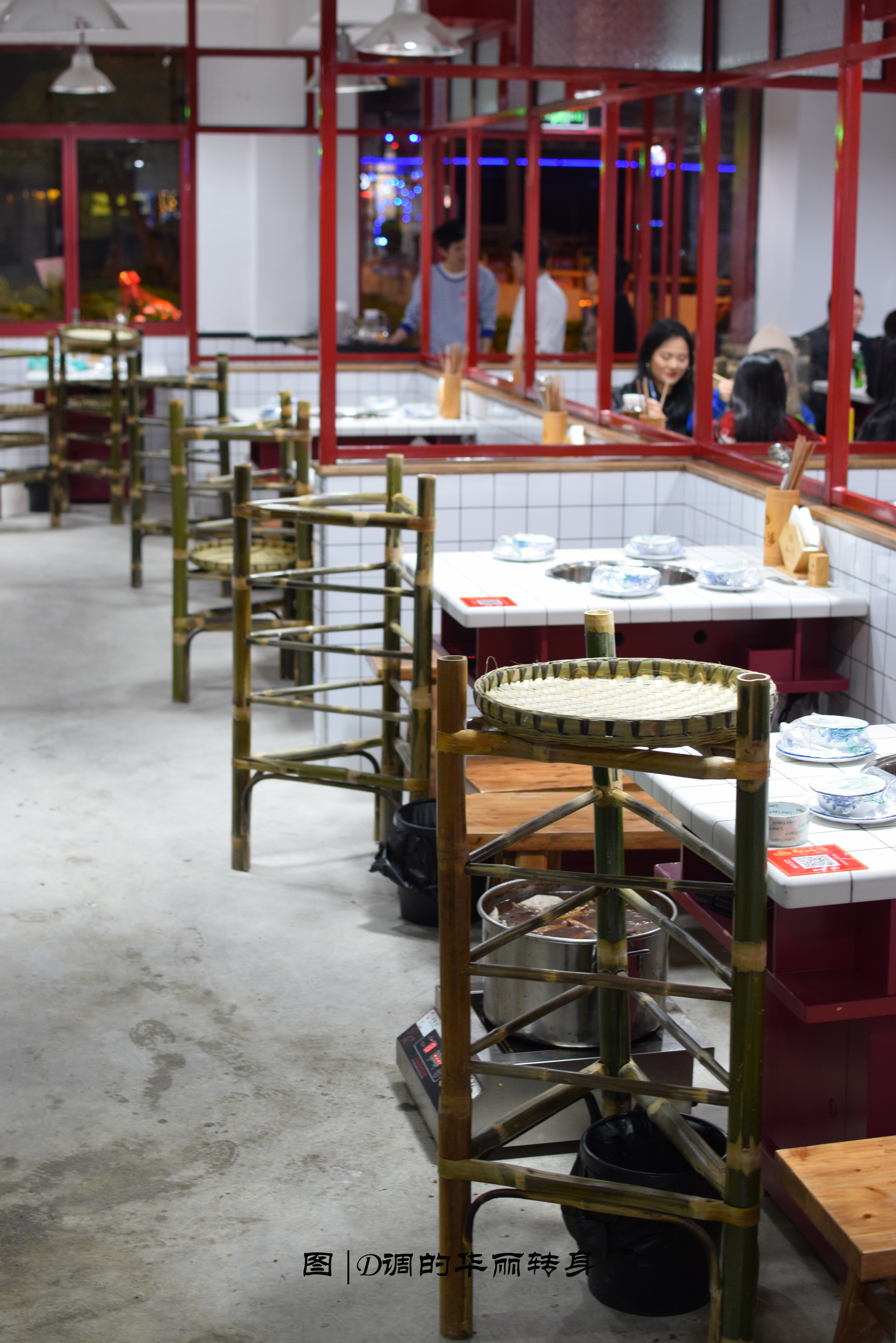 店内环境干净整洁,白色格子款式的桌子简洁大方,每一桌旁都有配套竹筛三角架,服务员上菜用竹筛端着相当特别。