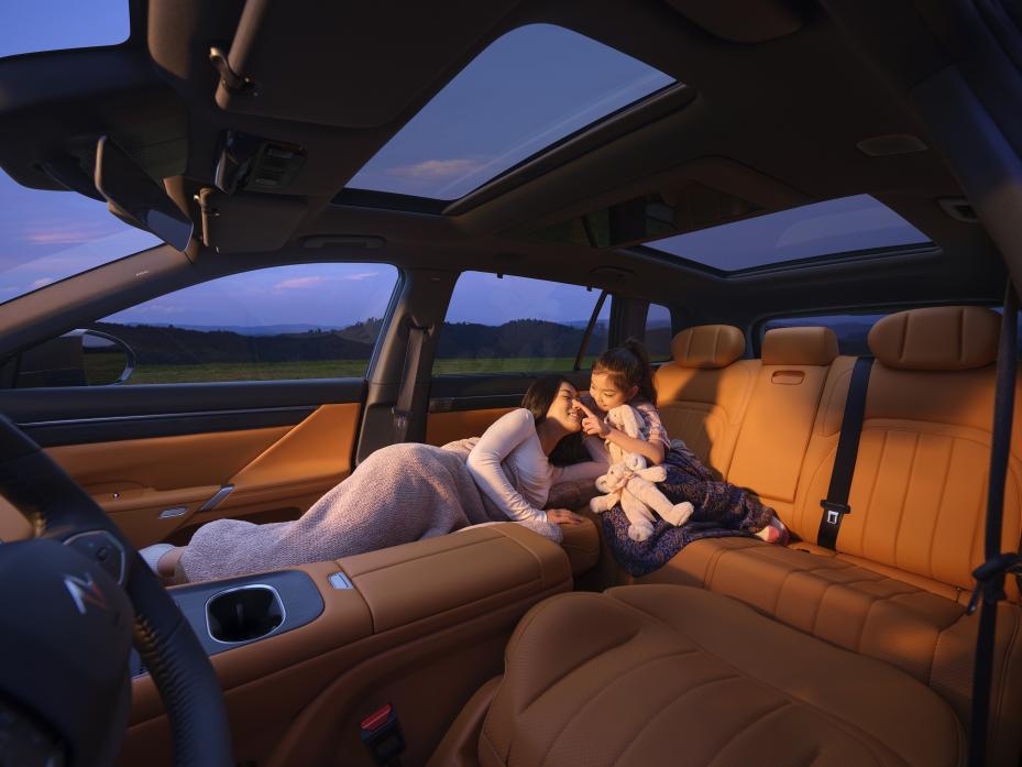 想午休时,把前排推到最前段,后排座椅放倒放倒,秒变2.4m×1.5m的“大床”。带着四岁的孩子,三人都能伸展平躺,跟零跑C16的1.8m床位相比,它直接多出0.6m的长度,真正实现“旅途可睡”。