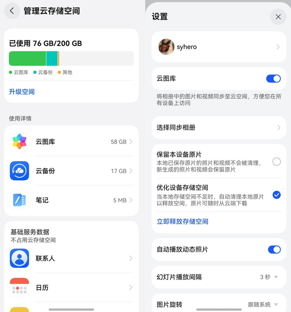 伴随着越来越沉积的图片和视频,问题又来了,如何安全保存这些难忘的瞬间,同时让手机保持充足的空间?这时候,鸿蒙6自带的华为云空间“云图库”功能就能派上用场了。开启云图库的“优化设备存储空间”后,系统不仅可以自动把手机上的照片视频都安全同步到云端,还能在手机空间紧张的时候,自动把手机上早先不常用的照片视频,替换成占用空间很小的预览版本,而原片则会安全地存到云端。而且只要平板和电脑上登录同一个华为账号,也能随时都能看到所有照片,非常便捷。