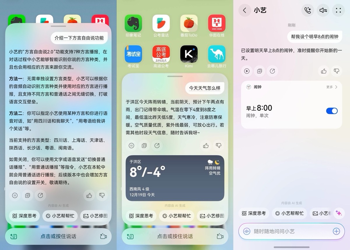 首先想说的是小艺的“方言自由说”,真的给足我们和AI交互的快乐。这个功能对我家特别实用。我爸妈普通话不太标准,以前让他们用语音助手总是很别扭。现在好了,升级到HarmonyOS 6后,小艺能听懂16种方言。我妈用老家话问天气、设闹钟,小艺不仅能听懂,还能用同样的方言回答她,两个人唠起嗑来那叫一个流畅。我听着我妈和小艺用熟悉的乡音交流,感觉科技一下子就有了温度。