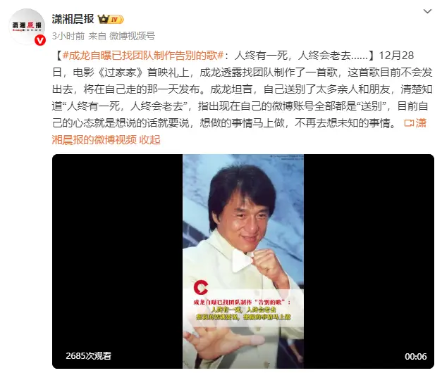 71岁成龙自曝制作“告别的歌”,坦言人终有一死,青春里的功夫超人也会老去