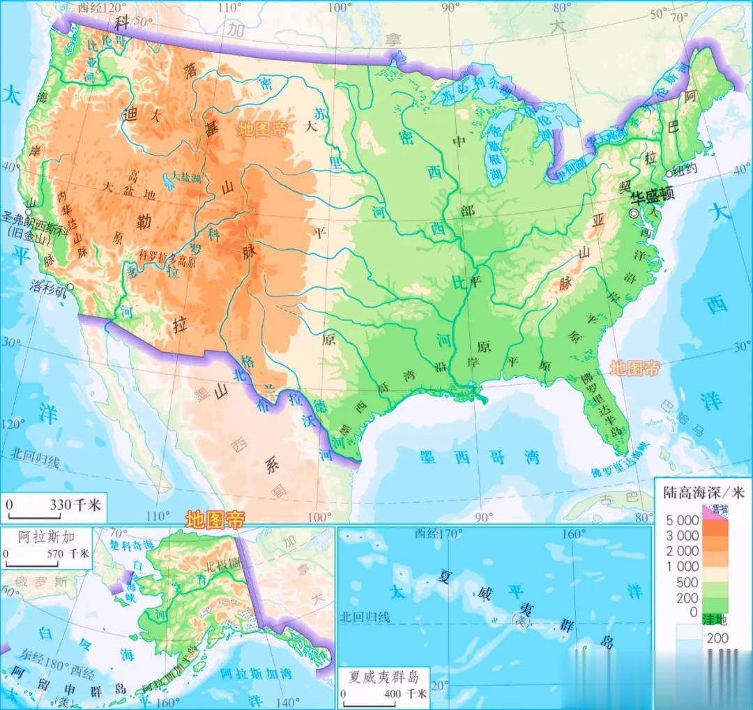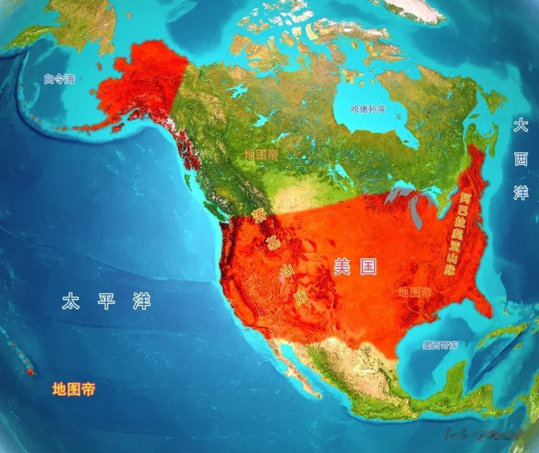 美国位于北美洲中部,包括北美洲西北部的阿拉斯加和太平洋中部的夏威夷群岛,以及若干海外领地,面积约937万平方千米。