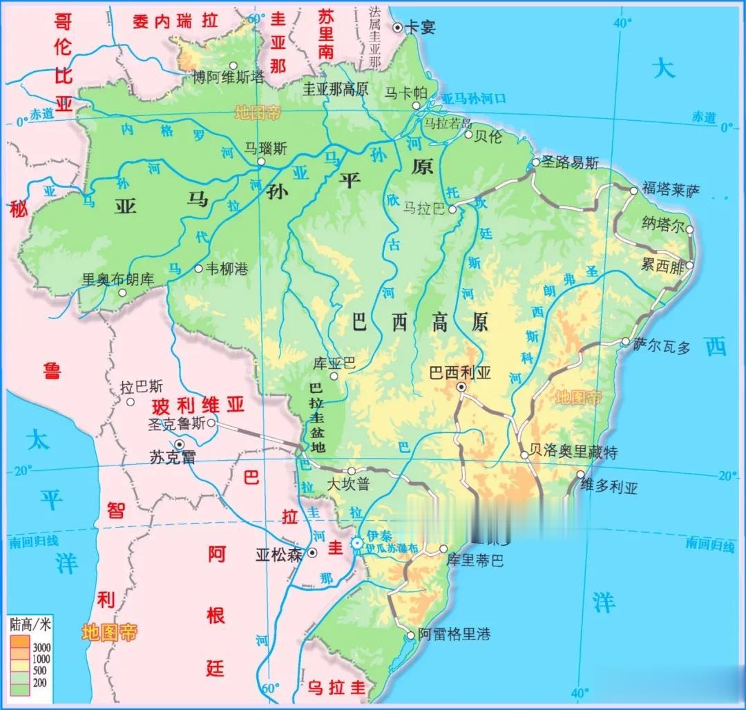 巴西位于南美洲东部,东濒大西洋,海岸线长约7400千米,面积约851.49万平方千米,居世界第五,南美洲第一。