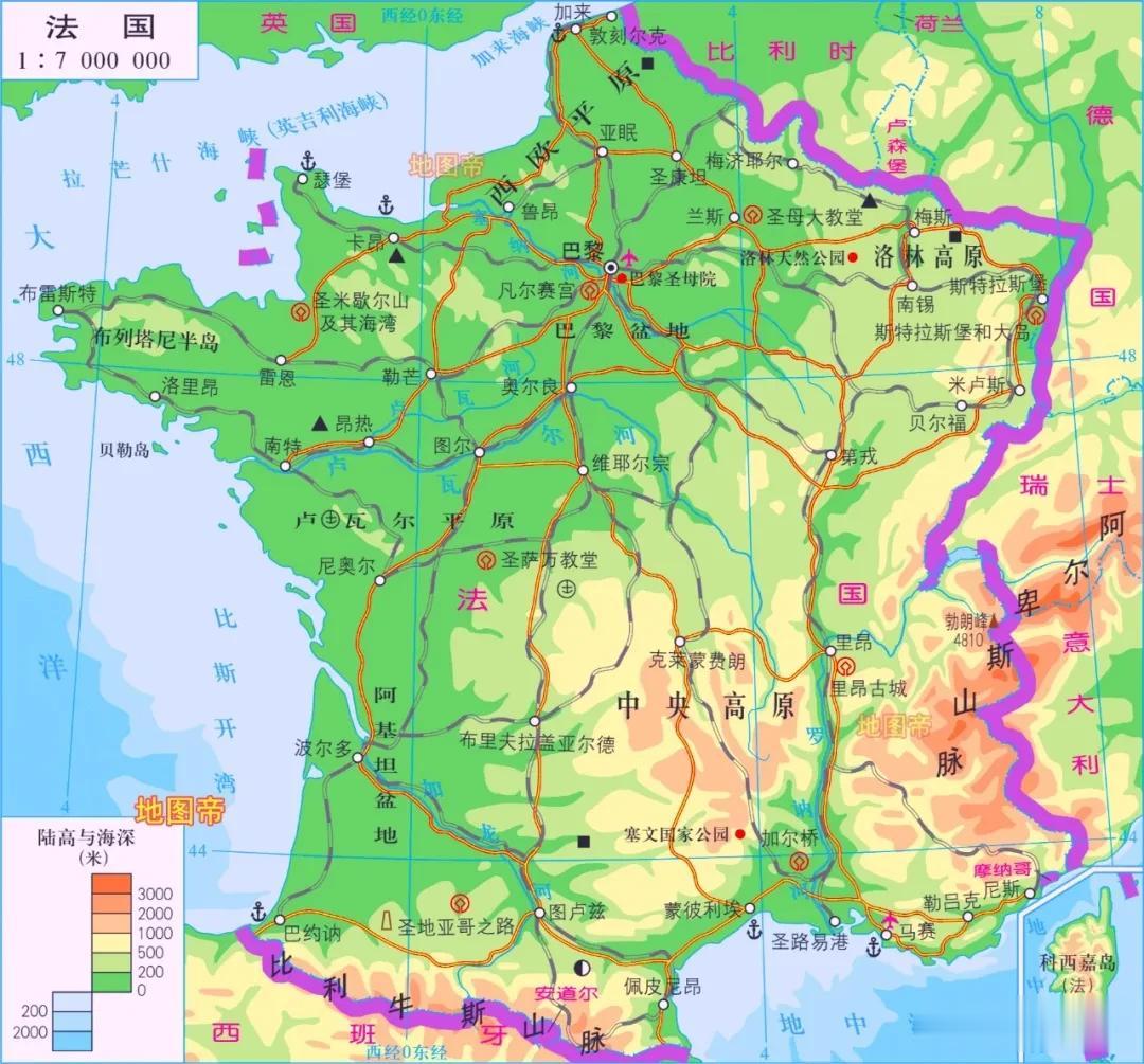 法国本土西部濒大西洋,东南临地中海,陆地边境线长2913千米,海岸线长3424千米;海外领地边境线长1263千米,海岸线长2000千米。