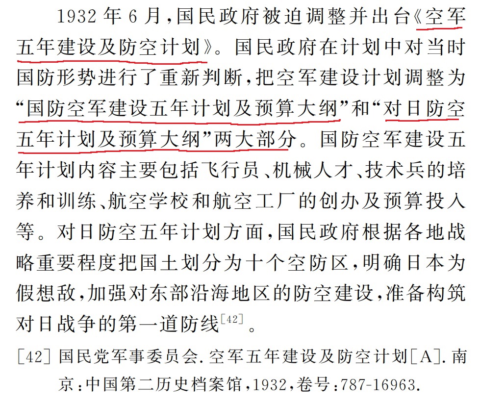 民国21年(1932年)6月,国民政府制定了《空军五年建设及防空计划》。该计划有两大部分,“国防空军建设五年计划及预算大纲“和”对日防空五年计划及预算大纲“。很明显把日本帝国的空中力量作为假想敌。