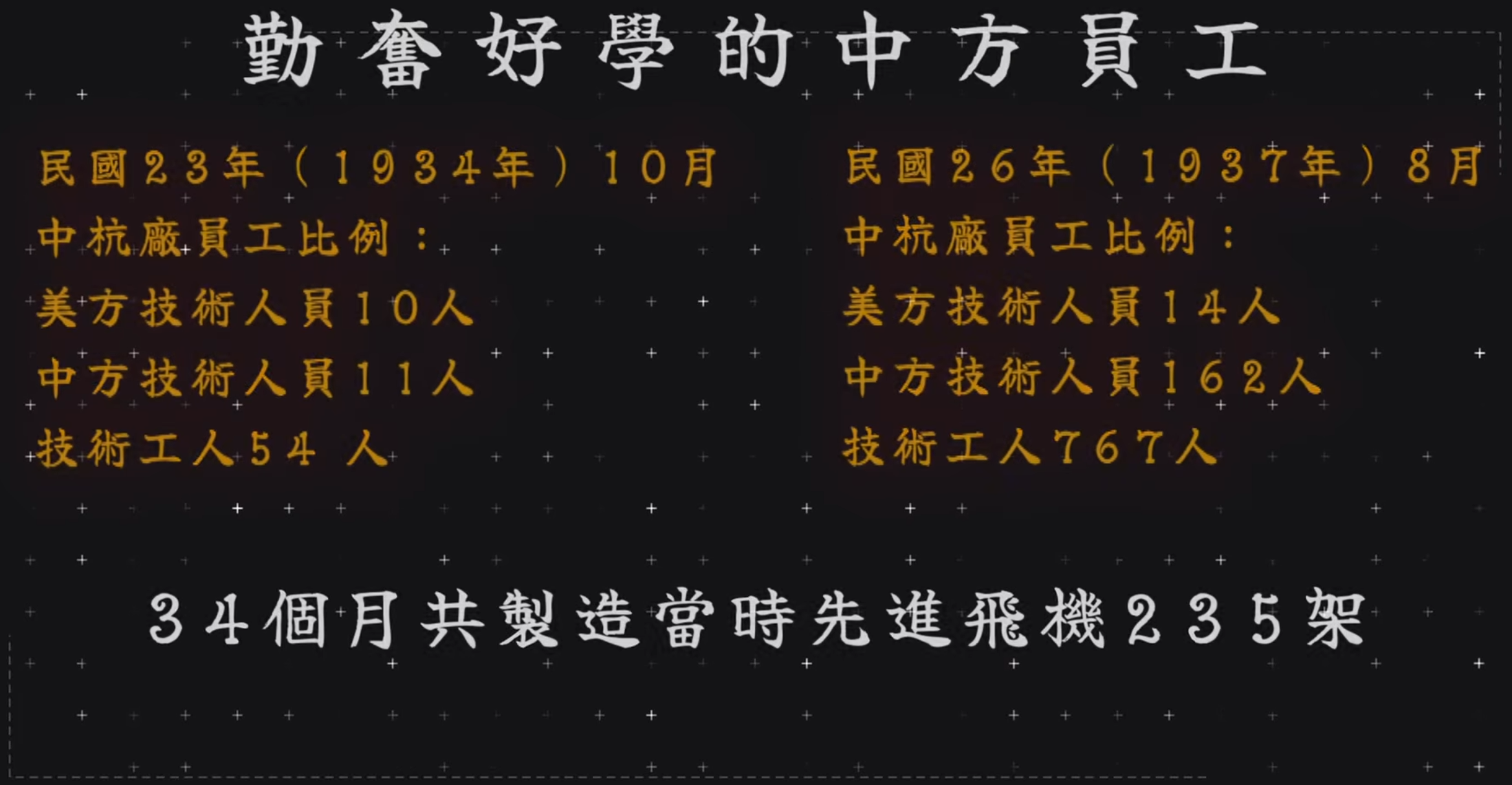 我国人员技术学习的很快。在民国23年(1934年)的中杭厂,美方技术人员10人,中方技术人员11人,技术工人54 人。到了民国26年(1937年)8月,全面抗战后内迁前的中杭厂。美方技术人员14人,中方技术人员162人,技术工人767人。4个月间最高峰的生产能力为4天一架飞机,共生产235架飞机。符合预计产能也符合学习进度。