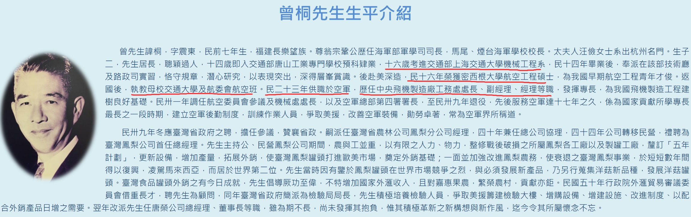 又有朋友问王助先生以前是波音工程师,专长就是飞机制造。为什么不是总工程师?我查询了中方总工程师曾桐先生的简历。哇塞~也不是泛泛之辈!曾桐来自福建长乐望族,父亲曾宗巩。曾宗巩天津水师学堂驾驶班第四届毕业生,在扬威号巡洋舰上参加过甲午黄海海战。民国后任海军上校和烟台海军学校校长,熟通英语有翻译著作。