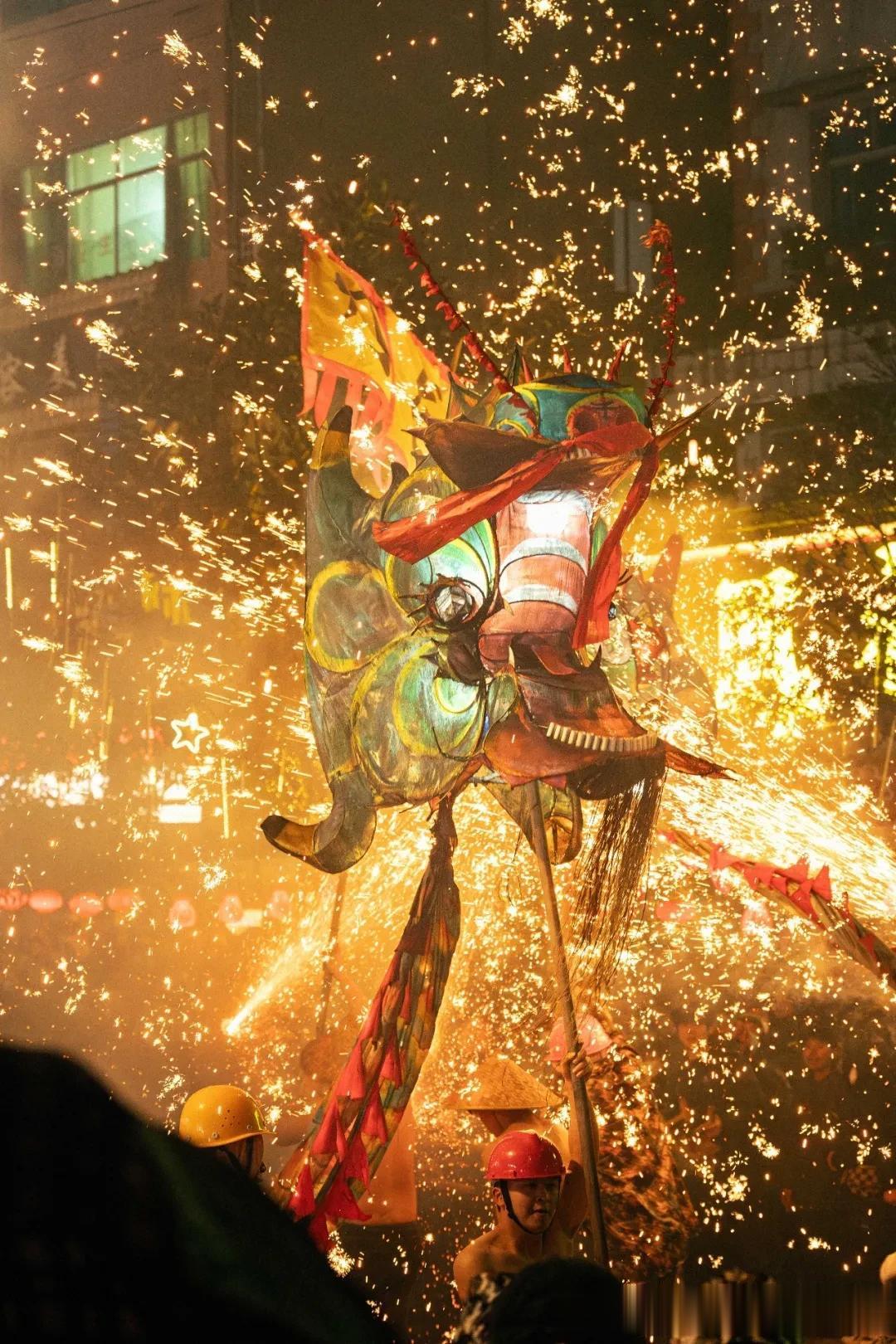 在黔东南台江县,元宵节的“舞龙嘘花”被称为“勇敢者的游戏”,也是世界上最“疯狂”的舞龙形式之一。赤膊的苗族汉子舞动巨龙,村民们手持用竹筒填充火药制成的“嘘花筒”,对着龙身和舞龙者疯狂喷射。刹那间,火光冲天,硝烟弥漫,整条街道化为火海。赤膊的汉子在火雨中穿梭,毫不在意迸射的火花,因为在他们的观念里,火能驱邪,日子就在这样的氛围中越炸越旺。