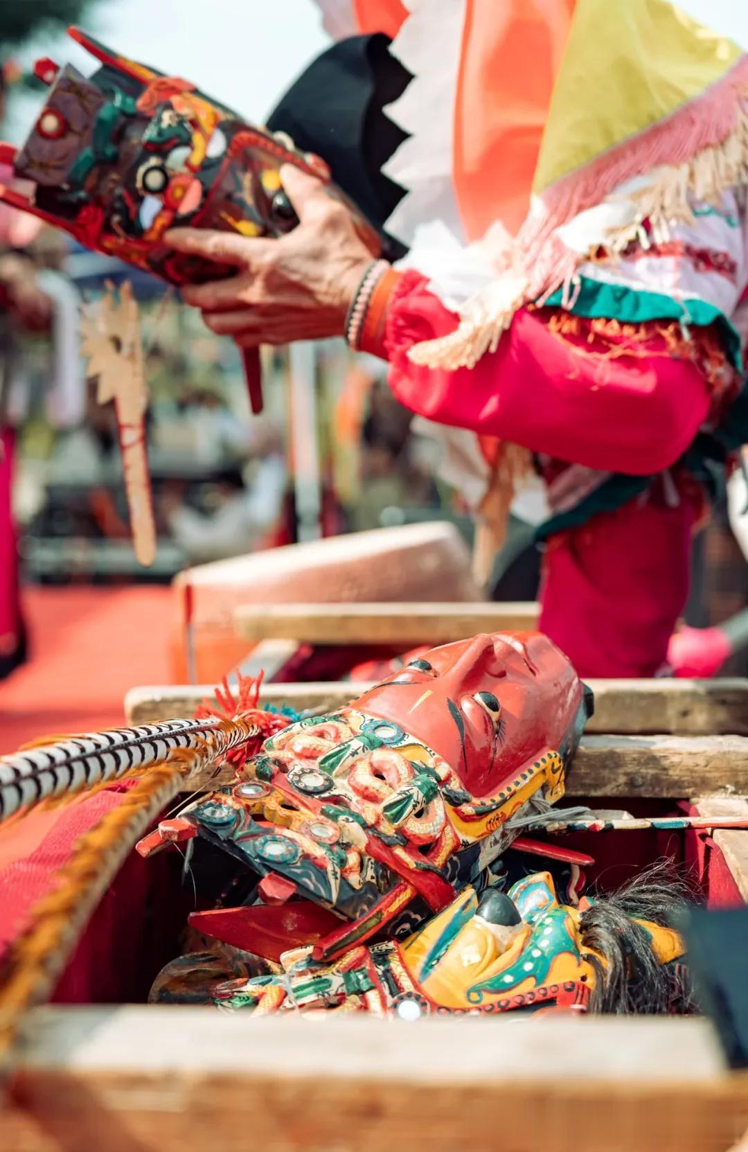 撮泰吉一般于农历正月初三至十五举行,主要的功能是挨家挨户扫寨,祝福五谷丰登、人畜兴旺。演员们戴着古朴夸张的木制面具,演绎祖先迁徙、繁衍、开荒、耕作、丰收的故事,恰好与草海边候鸟的迁徙遥相呼应。过年,此刻不再仅仅是人的节日,也是万物生灵的共同庆典。