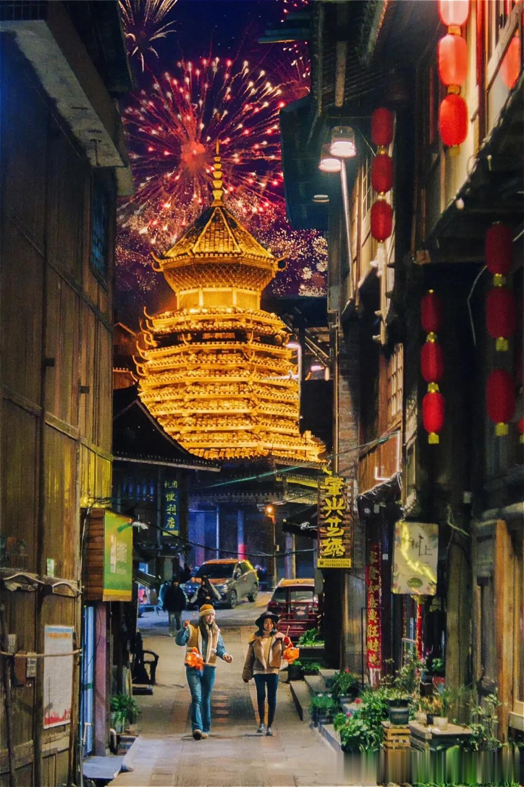 肇兴侗寨的春节,有鼓楼与烟花同框。