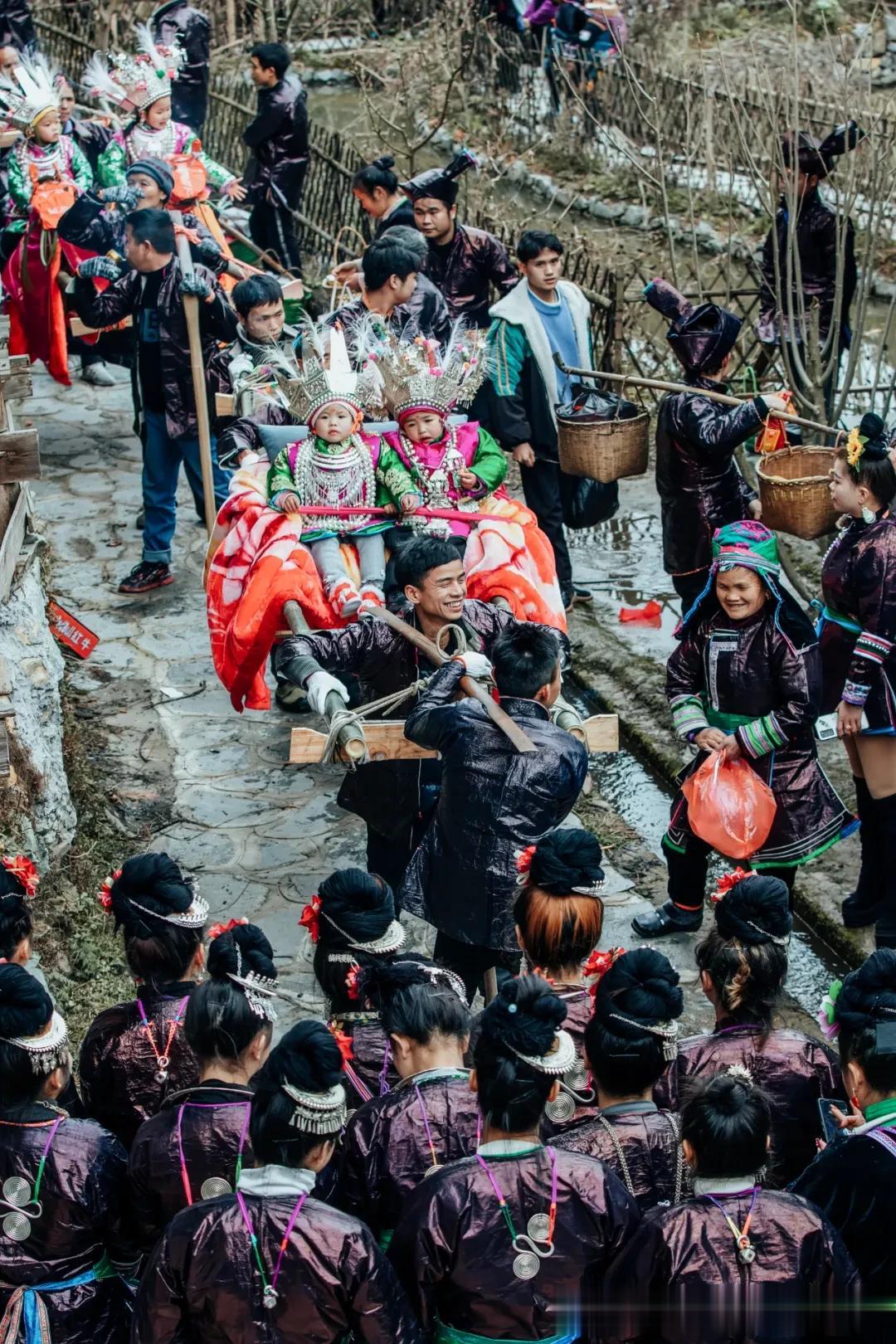 在黄岗过年,“抬官人”是“月也”中最有意思的活动。农历正月初八,身着盛装的小孩坐在滑竿或竹马上,由几人抬着出巡,就像是一场侗寨版的“花车巡游”,这既是娱乐,也饱含着大人对孩子前程似锦的祝福。官人的身后还跟着一队随从,有的衣衫褴褛,脸抹成黑色,有的扮成妖魔鬼怪,还有手撑花伞、身着盛装的年轻姑娘。