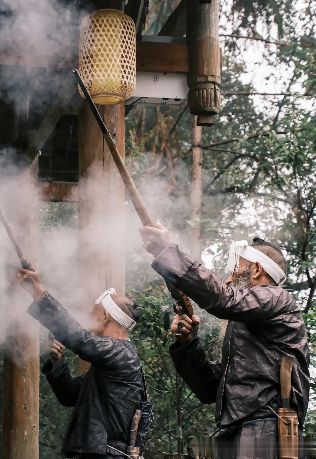 岜沙苗寨迎客的鸣枪仪式。