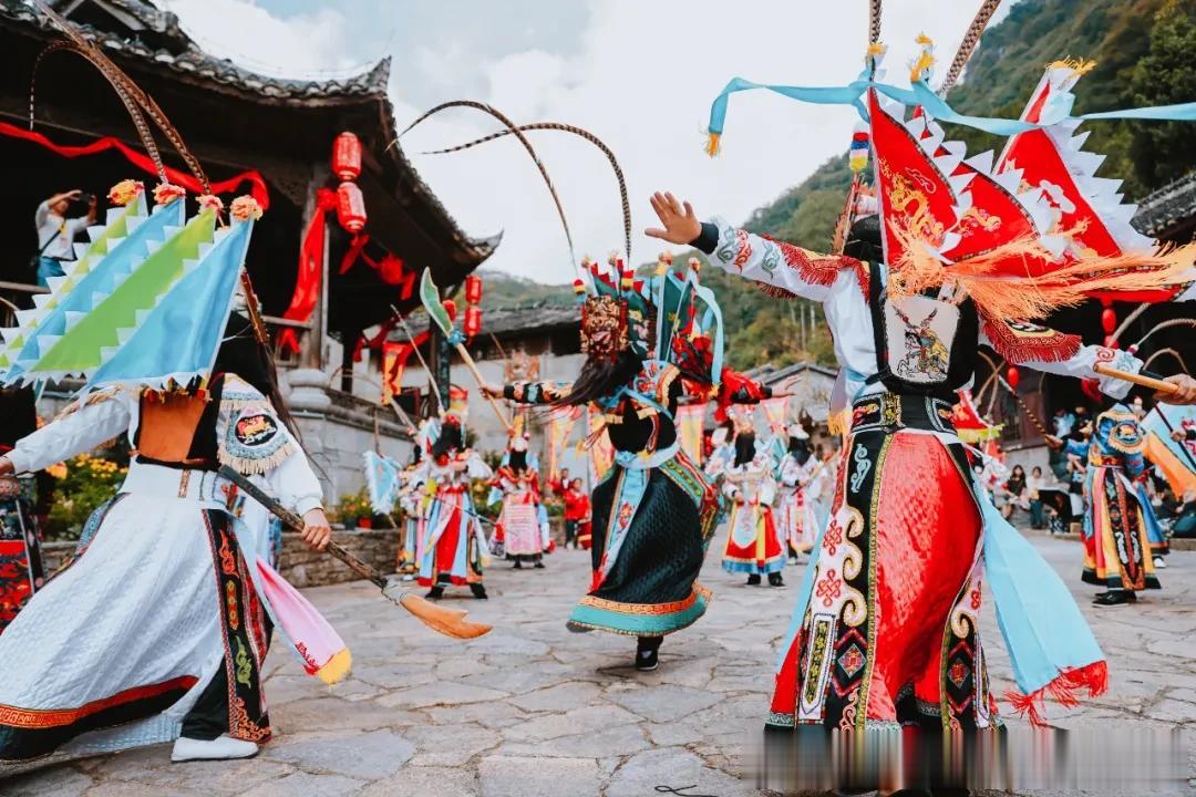 在屯堡,年味是伴随着开箱声苏醒的。村民们小心翼翼地从木箱里“请”出地戏“脸子”(面具)。白杨木雕刻的关羽、张飞面具,怒目圆睁,色彩鲜艳。戴上面具的那一刻,平时沉默寡言,只顾在田间劳作的汉子立刻变身镇守边疆的将军。这种“人神合一”的瞬间,比任何精心排练的晚会都更让人震撼。