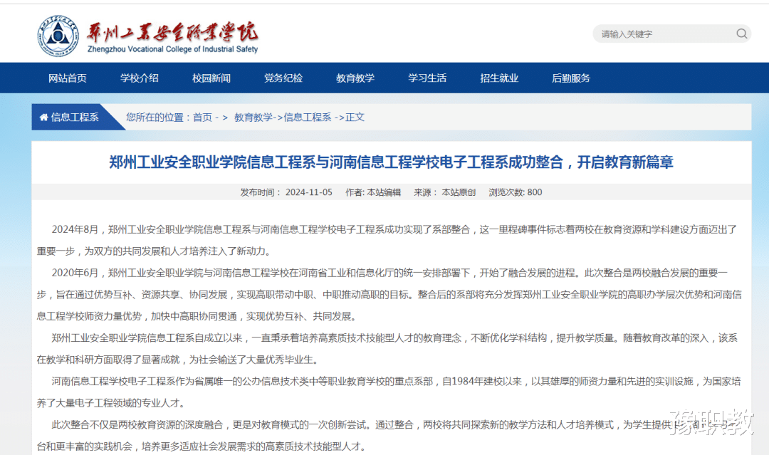 2024年8月,郑州工业安全职业学院信息工程系与河南信息工程学校电子工程系成功实现了系部整合。