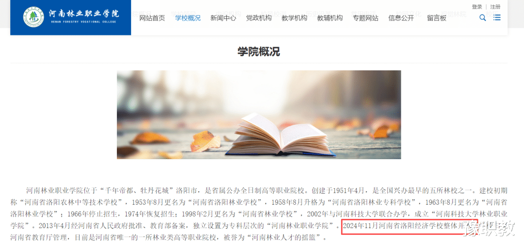 1、河南林业职业学院与河南省洛阳经济学校合并2024年12月,河南省洛阳经济学校整体并入河南林业职业学院,进行高职层次教育,两校实现实质合并。合并后新校占地面积700亩,在校生达15000人,形成了涵盖林业、经济等多学科的专业体系。