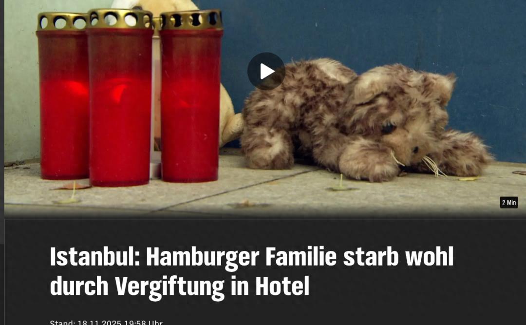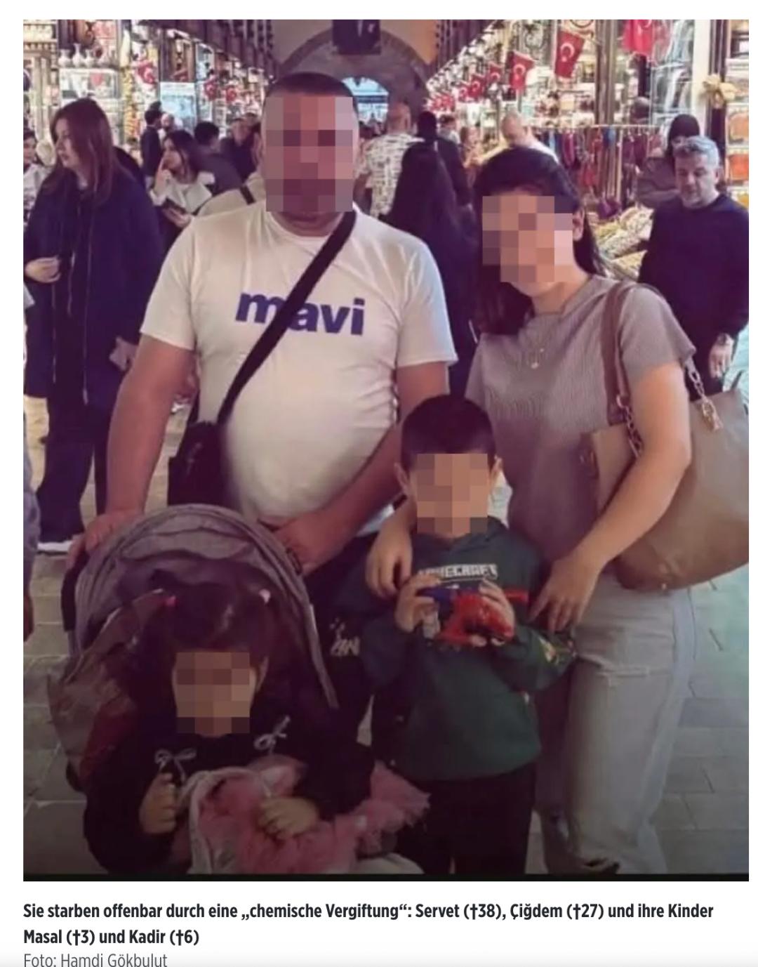 来自德国汉堡的土耳其裔家庭 ——3 岁女儿马萨尔( Masal)、6 岁儿子 卡迪尔(Kadir)与母亲奇格德姆(Çiğdem B.)、父亲塞尔维特(Servet B.),在伊斯坦布尔度假期间相继身亡。随着土耳其法医机构初步毒理报告的公布,真相逐渐浮出水面:四人并非死于最初怀疑的食物中毒,而是酒店内的化学性中毒。