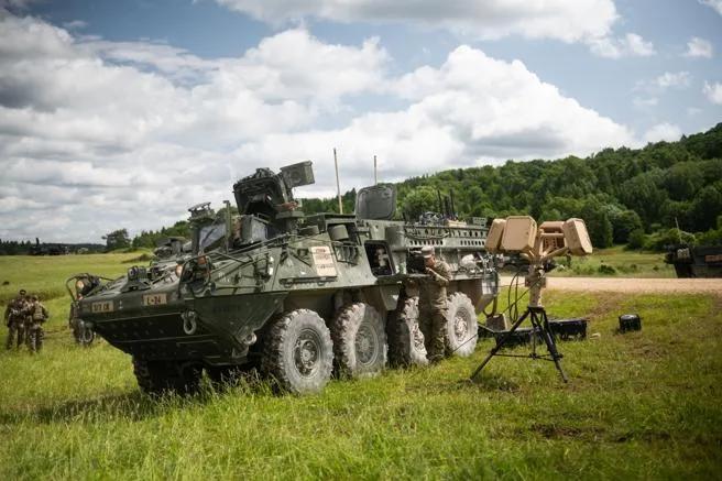 美军去年曾使用M1126运兵型史崔克装甲车(左),配备“回声盾”系统(右)进行移动部署测试。