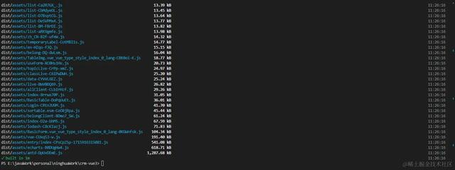 let antdSplitArr = [ 'node_modules/ant-design-vue/es/table', 'node_modules/ant-design-vue/es/select', 'node_modules/ant-design-vue/es/form', 'node_modules/ant-design-vue/es/menu', 'node_modules/ant-design-vue/es/vc-picker', 'node_modules/ant-design-vue/es/_util', 'node_modules/ant-design-vue/es/vc-table', 'node_modules/ant-design-vue/es/vc-select',]在build中,使用包id匹配的方式,进行详细分包build:{ rollupOptions:{ output:{ manualChunks(id){ for(let i = 0; i < antdSplitArr.length; i++){ if(id.includes(antdSplitArr[i])){ return 'antd-split' } } if(id.includes('node_modules/echarts')){ return 'echarts' }else if(id.includes('node_modules/ant-design-vue/es/')){ return 'antd' }else if(id.includes('node_modules/vue') || id.includes('node_modules/pinia') || id.includes('node_modules/vue-router')){ return 'vue' }else if(id.includes('node_modules/@ant-design/icons-vue') || id.includes('node_modules/lodash') || id.includes('node_modules/sortable')){ return 'antd-icon-ld-sortable' } } } } },最后再看一下打包结果吧: