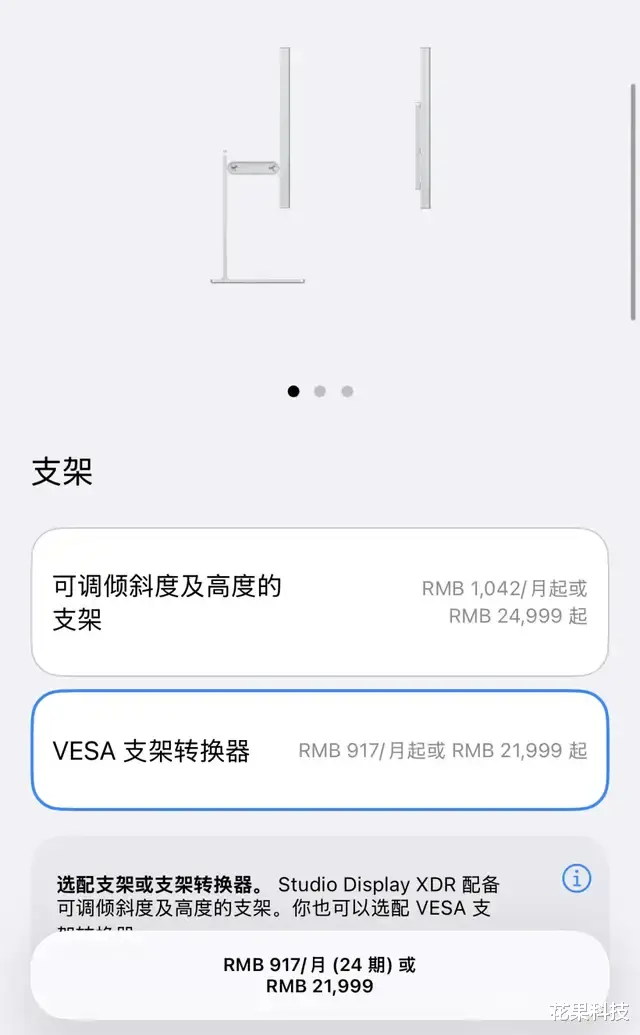 官网最新界面显示,新款 Studio Display XDR 显示器「VESA 支架转换器」版本起售价由原来的 24999 元降价到了 21999 元。