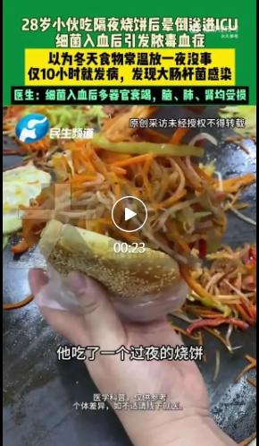 11月20日(采访),河南郑州一28岁小伙以为冬天气温低,烧饼常温放一夜没事,第二天也没加热,直接食用,没想到仅10小时就晕倒昏迷,被送进医院ICU抢救。