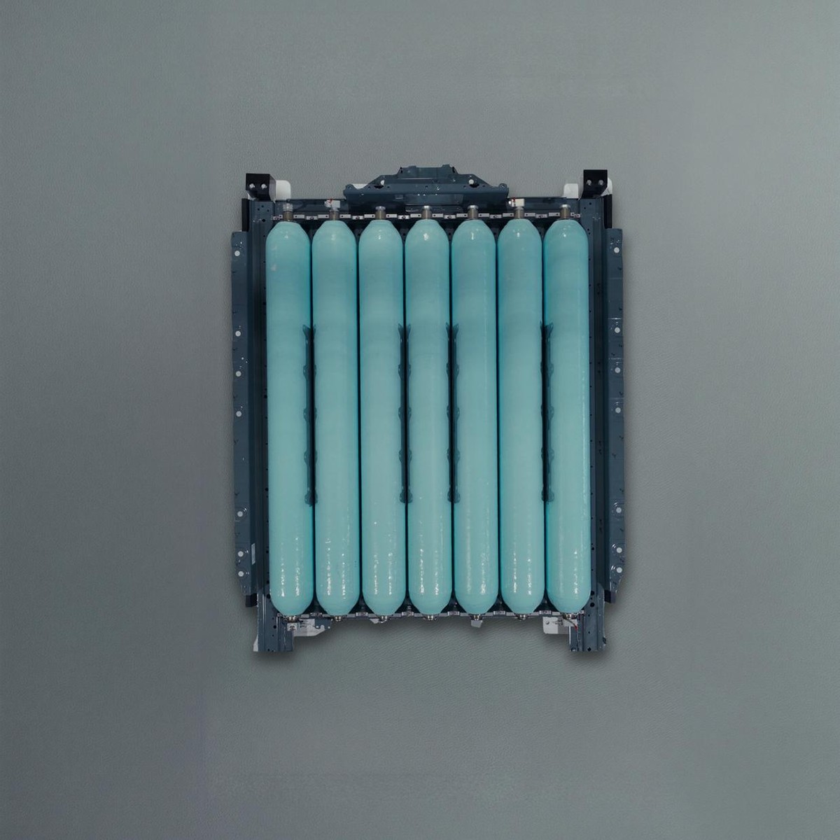 全新的BMW 氢能扁平化储存系统由七个高压碳纤维复合材料储氢罐组成,这些储氢罐以并联方式集成在坚固的金属框架中。其创新技术在于:系统并非采用多个独立压力容器,而是通过相互连通的7个腔体构成一个封闭整体,并由中央主阀统一控制。另外,700巴(bar) 高压储氢罐同时受益于车身结构所提供的机械防护,进一步提升了整体安全性。