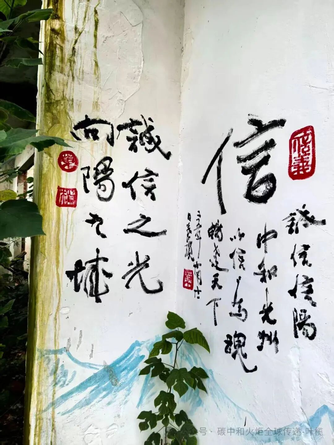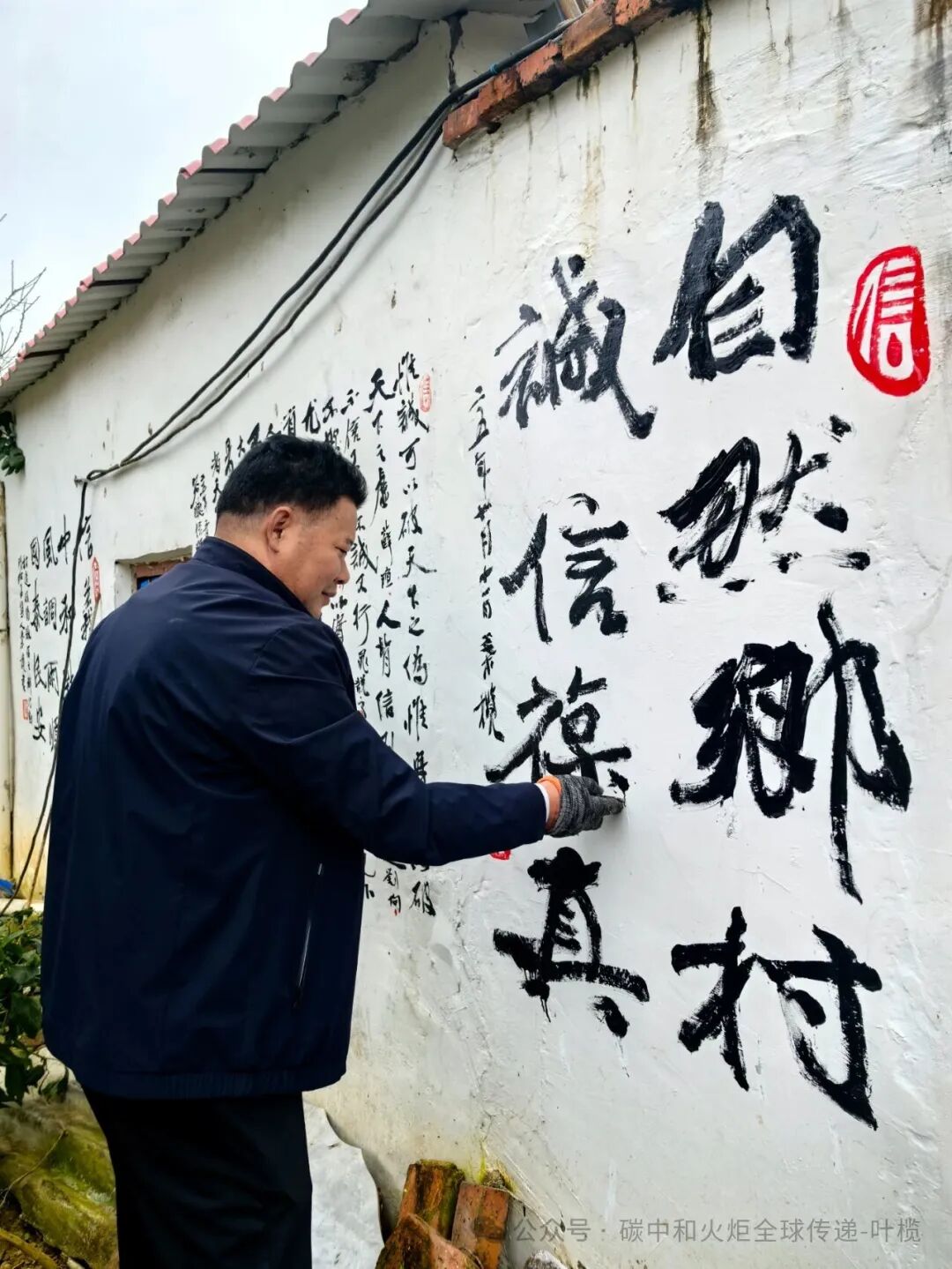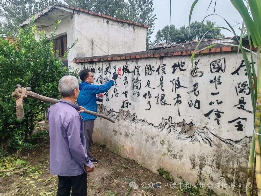 (叶榄和宋保海在信字村开展最低成本的乡村建设,如果请专业团队做墙绘,需要数千元。由叶榄来写,只需要油漆、毛笔等几百元成本。)